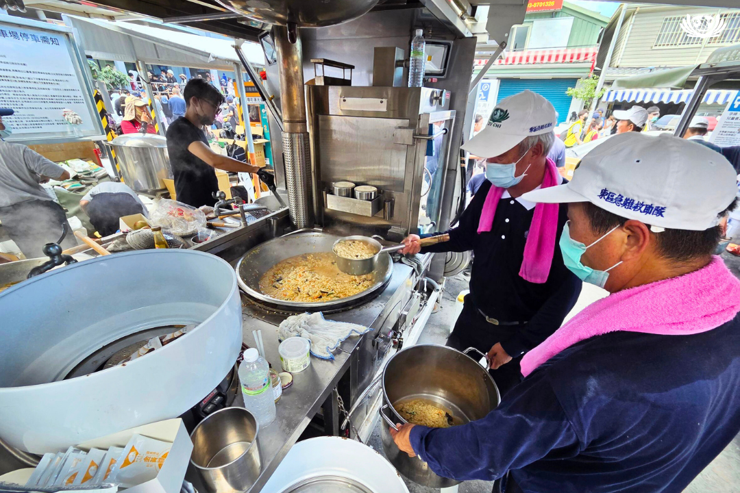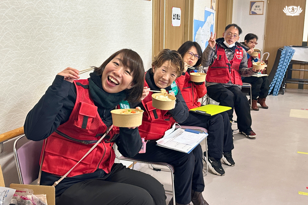 LEFT: Volunteers operate the Tzu Chi mobile kitchen outside Guangfu Railway Station in Hualien County, preparing large pots of hot meals for residents affected by Typhoon Ragasa and for relief workers. | Photo: Jia-Bin Wang (王嘉彬) RIGHT: Medical personnel from across Japan enjoy hot vegetarian meals prepared by volunteers during a break at Anamizu General Hospital, bringing warmth and comfort amid relief work after the Noto Peninsula earthquake. | Photo: Angeline Fransisca (施美君)