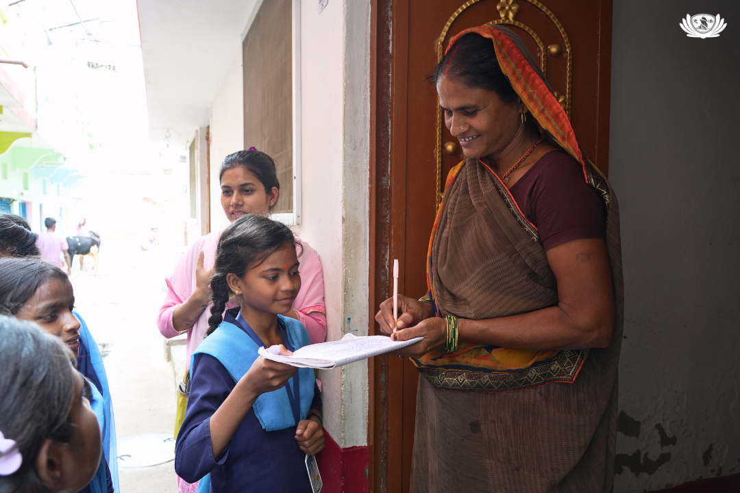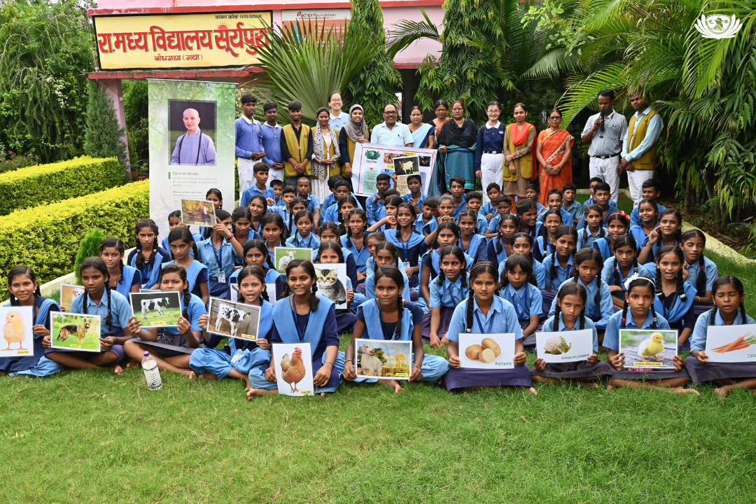 LEFT: Students at Suryapura Middle School in Bodhgaya, India, take part in a vegetarian promotion activity led through drama by Tzu Ching youth volunteers. | Photo: Tsun-Chih Cheng (鄭村池) RIGHT: Radhika Kumari (center), a seventh-grade student from Suryapura Middle School, has been vegetarian for two years and says, “We should treat everyone equally and love all animals,” as she invites a neighbor to support plant-based eating. | Photo: Mun-Fei Yong (楊文輝)